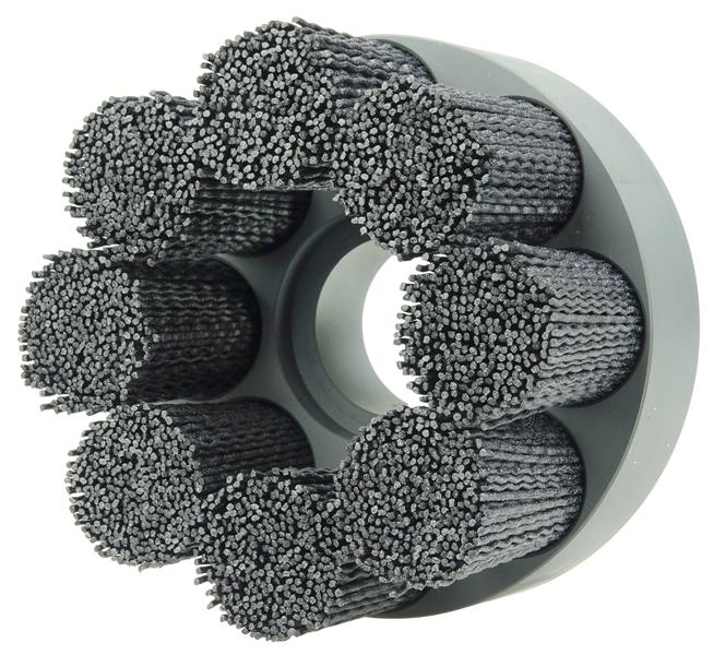 Nylon Disc Brushes - Weiler's Nylon disc brushes are manufactured using a tufted filament configuration and longer trim length for increased aggression, greater conformability and longer product life in comparison to monofilament disc brushes which feature a distribution of short individual bristles. Burr-Rx Disc Brushes feature Weiler's advanced black ceramic grain filament which delivers up to a 400% greater edge cutting action in comparison to traditional silicon carbide and aluminum oxide filaments for the fastest, most aggressive deburring action for minimum cycle times and maximum media life. All Burr-Rx Disc Brushes are manufactured using a process which results in a very consistent, flat brush face in comparison to traditional construction which utilizes a molded backing. The high dimensional precision of these tools means that the brushes are suitable for the most critical applications and perform more consistently from first part to last. In addition, the machined polymer backings are designed to mount directly onto a standard shell mill holder for convenient use in CNC machining centers. Burr-Rx Shell Mill Holder Disc Brushes - Crimped Black Ceramic Filament.