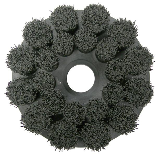 Nylon Disc Brushes - Weiler's Nylon disc brushes are manufactured using a tufted filament configuration and longer trim length for increased aggression, greater conformability and longer product life in comparison to monofilament disc brushes which feature a distribution of short individual bristles. Burr-Rx Disc Brushes feature Weiler's advanced black ceramic grain filament which delivers up to a 400% greater edge cutting action in comparison to traditional silicon carbide and aluminum oxide filaments for the fastest, most aggressive deburring action for minimum cycle times and maximum media life. All Burr-Rx Disc Brushes are manufactured using a process which results in a very consistent, flat brush face in comparison to traditional construction which utilizes a molded backing. The high dimensional precision of these tools means that the brushes are suitable for the most critical applications and perform more consistently from first part to last. In addition, the machined polymer backings are designed to mount directly onto a standard shell mill holder for convenient use in CNC machining centers. Burr-Rx Shell Mill Holder Disc Brushes - Crimped Black Ceramic Filament.