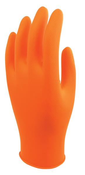 These gloves are made of 7 mil high-visibility orange powder-free heavyweight nitrile. They feature a Tractor Tread patterned grip for an excellent for wet, oily or dry grip. They are disposable, ambidextrous, 9.5 inches in length, and have a rolled/beaded cuff. They come 100 gloves to a dispenser box, 10 dispenser boxes per case and comply with FDA regulations for food contact. Anti-static/electrostatic compliant for use in ESD protection areas