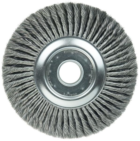 Weiler 12" Wide Face Standard Twist Knot Wire Wheel Brush features four rows of tightly knotted wire that are ideal for use in automated cleaning processes such as removing light mill scale from metal rod and wire. Featuring Weiler's individual knot hole construction, these radial brushes are available in heat-treated steel, type 302 stainless steel and bronze wire for use in a wide variety of applications. 2" arbor hole for use on bench and pedestal grinders.