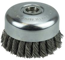 Weiler 4" Double Row Knot Wire Cup Brush features an nternal nut for use on dedicated equipment such as line traveling machines that clean and prep the O.D. of pipe prior to coating. 5/8"-11 nut for use on right angle grinders.