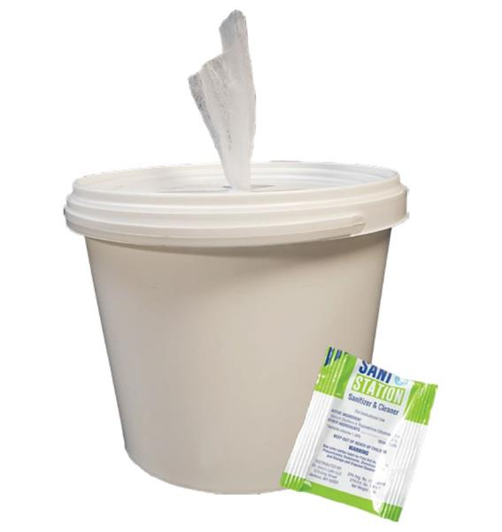 Includes: Re-usable bucket, Roll of 300 wipes, and sanitizer/cleaner packet