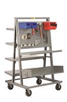 2000 lbs. capacity. Use in your Lean Manufacturing facility to transport and store components or finished products where and when you need them. Slotted steel uprights accept flush shelves, 9" or 15" deep trays, and pegboard panels making this a versatile ergonomic product. Mix and match to fit your exact requirements. Since it is adjustable you can reconfigure the truck as your needs change. Available as a single sided or double sided unit.