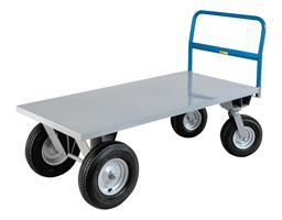 2500 lbs. capacity. Built for heavier service and larger loads, these pneumatic tired steel platform trucks feature axle mounted load wheels with 1" roller bearings, and heavy service swivel caster brackets. Larger wheels increase mobility over the roughest terrain. High platform minimizes bending when loading.