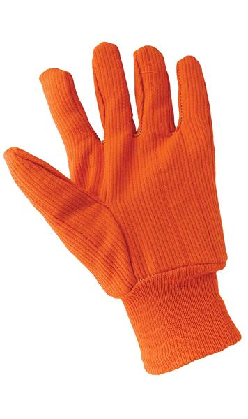 These 18 oz. corded, 100% cotton gloves are orange and feature a matching knit wrist cuff and a straight thumb. These gloves are and excellent choice for applications that require hand visibility for safety.