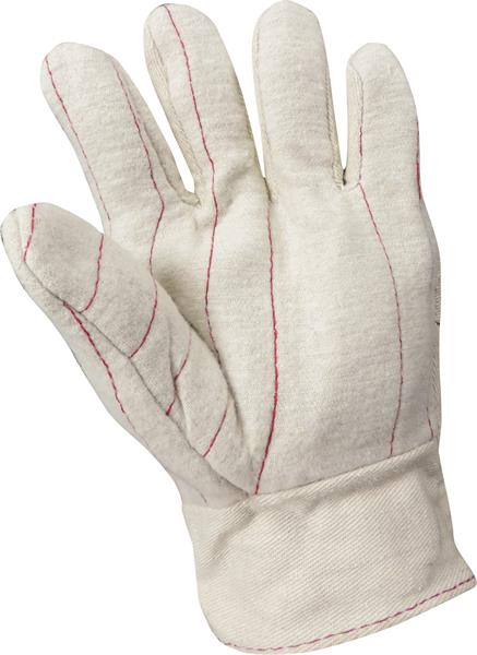 These 26 oz. two-layer cotton hot mill gloves feature a 2.5 in. band top cuff, clute cut style and a wing thumb. They are ideal for operations requiring a glove that can safely withstand mild temperatures.