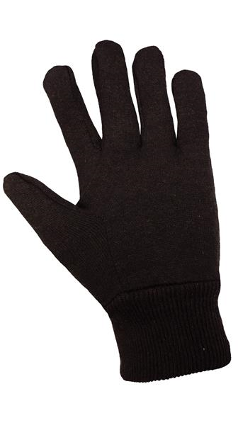 These 9 oz. dark brown clute cut economy polyester/cotton jersey gloves feature a knit wrist and straight thumb.