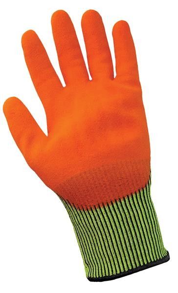 These gloves are constructed with an enhanced seamless high-visibility 13-gauge Tuffalene brand UHMWPE. They feature a high-visibility orange Mach Finish nitrile dipped palm and silicone impact protection. The silicone impact protection is very flexible and comfortable. The Mach Finish nitrile provides excellent wet/oily grip and also has great abrasion resistance for long wearing qualities. Great for jobs that require high-visibility and a high cut resistant level.