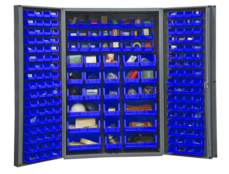 48 in. wide, 14 gauge, lockable cabinet, with 176 Blue hook-on bins, deep door style. Gray textured powder coat finish.