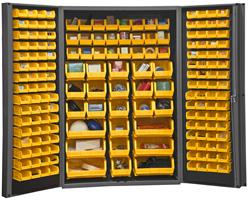 48 in. wide, 14 gauge, lockable cabinet, with 176 yellow hook-on bins, deep door style. Gray textured powder coat finish.
