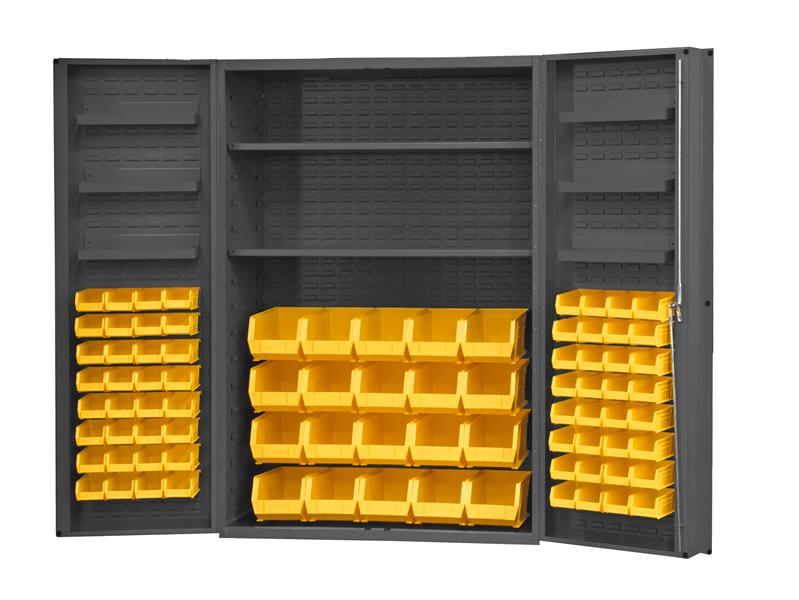 48 in. wide, 14 gauge, lockable cabinet, with 84 yellow hook-on bins, 2 adjustable shelves, 6 door shelves, deep door style. Gray textured powder coat finish.