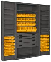 36 in. wide, 14 gauge, lockable cabinet, with 58 yellow hook-on bins, 1 fixed shelf, 1 adjustable shelf, 4 drawers, 12 door shelves, deep door style, Gray.
