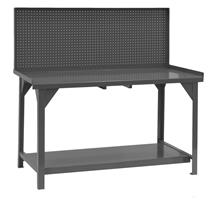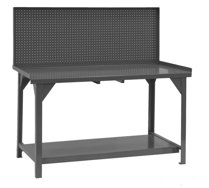 Durham heavy duty workbench with back and end stops, and pegboard. Top is 12 gauge thick reinforced steel plate. Angle iron stiffeners under work surface. Provides 4000 pounds capacity. It includes a 12 gauge steel lower shelf with 500 pounds capacity. Provision for optional drawers included. Foot pads with pre-drilled holes allow lagging to the floor. Ships fully assembled ready for use.
