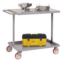 Welded service cart design with no corner upright posts allows easier access to contents on lower shelf.
