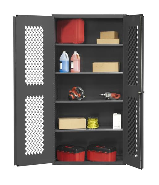 Durham ventilated cabinet with 4 adjustable shelves, is made of Heavy duty all welded 14 gauge steel construction. Full height welded piano hinges for increased strength and rigidity of doors. Double doors open at 180 degrees. Adjustable shelves rest on louver uprights and adjust on 4 in. centers (no tools required). Shelves hook easily into place with no tools required. Gray, textured powder coat finish.