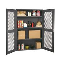 Durham ventilated cabinet with 3 adjustable shelves, is made of Heavy duty all welded 14 gauge steel construction. Full height welded piano hinges for increased strength and rigidity of doors. Double doors open at 180 degrees. Adjustable shelves rest on louver uprights and adjust on 4 in. centers (no tools required). Shelves hook easily into place with no tools required. Gray, textured powder coat finish.
