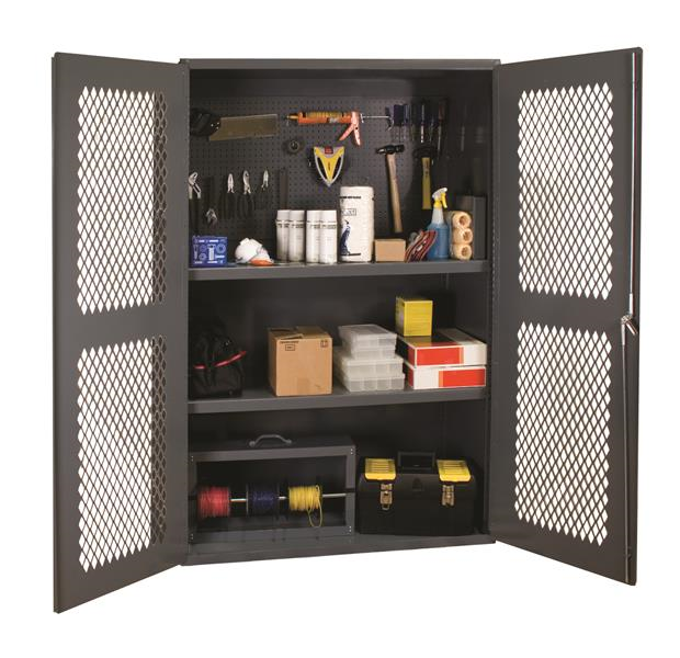 Durham ventilated 5-S storage cabinet with steel pegboard and 2 adjustable shelves. Heavy duty all welded 14 gauge steel construction. Flush doors feature punched diamond pattern allowing for quick visibility an ventilation of contents. Double doors open at 180 degrees for full access to product. 700 pounds capacity per shelf (weight evenly distributed). Pegboard holes are 1/4 in. diameter and are punched on 1 in. centers They accommodate standard peg hooks. (peg hooks not included). Gray, textured powder coat finish.