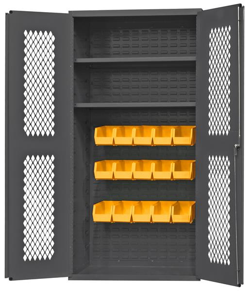 Durham ventilated cabinet with 15 yellow bins and 2 adjustable shelves. Double Doors open at 180 Degrees. Adjustable shelves rest on louver uprights and adjust on 4 in. centers (no tools required). Fully welded back louvered panels accommodate hook-on-bins. Shelves and bins hook easily into place. Gray powder coat finish. Flush Door Style.