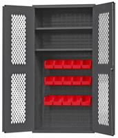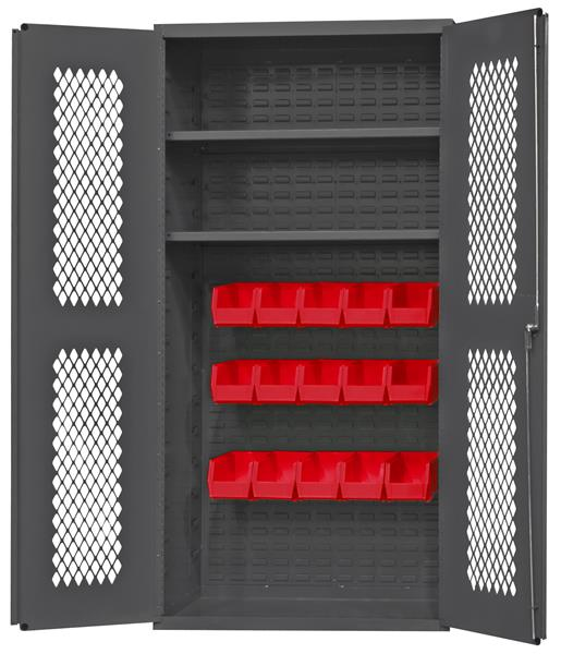 Durham ventilated cabinet with 15 red bins and 2 adjustable shelves. Double Doors open at 180 Degrees. Adjustable shelves rest on louver uprights and adjust on 4 in. centers (no tools required). Fully welded back louvered panels accommodate hook-on-bins. Shelves and bins hook easily into place. Gray powder coat finish.