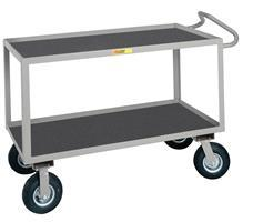 All-welded steel utility cart with cushion load wheels provide a smooth ride over rough or uneven surfaces. Available with or without nonslip vinyl shelf surface.