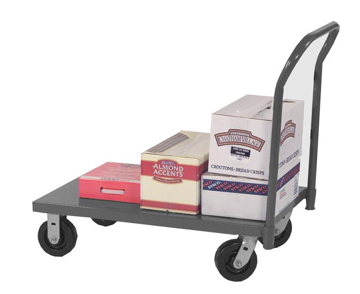 Durham platform truck. 6 in. by 2 in. phenolic bolt-on casters;(2) swivel and (2) rigid. Platform is 9-1/8 in. above the floor. Handle extends 36 in. above floor. Easy to assemble, no tools required. Gray, textured powder coat finish.