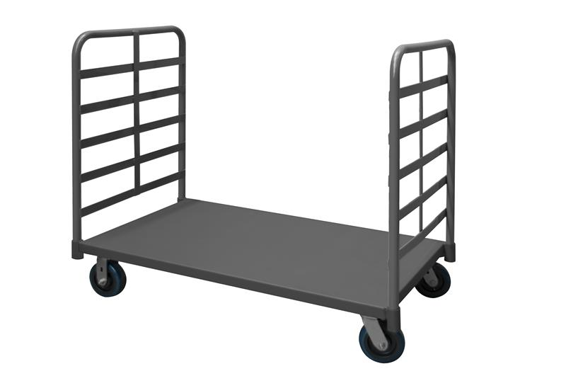 Durham platform truck. 6 in. by 2 in. polyurethane bolt-on casters;(2) swivel and (2) rigid. Easy to assemble, no tools required. Includes 2 Removable Handles. Gray, textured powder coat finish.