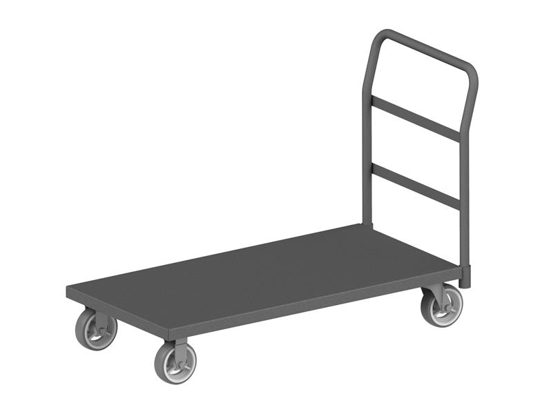 Durham platform truck. 5 in. by 2 in. Mold-On Rubber bolt-on casters;(2) swivel and (2) rigid. Easy to assemble, no tools required. Gray, textured powder coat finish.