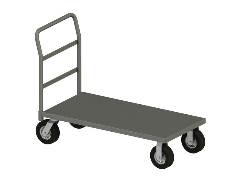 Durham platform truck. 10 in. by 3-5/16 in. pneumatic bolt-on casters;(2) swivel and (2) rigid. Easy to assemble, no tools required. Gray, textured powder coat finish.