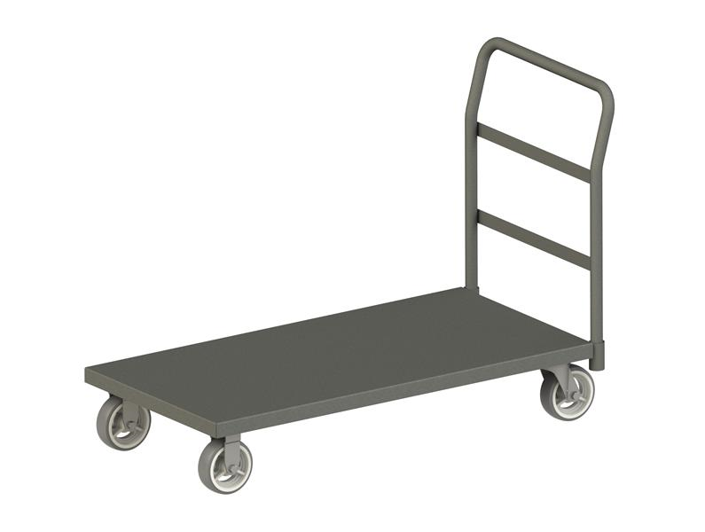 Durham platform truck. 8 in. by 2 in. Mold-On Rubber bolt-on casters;(2) swivel and (2) rigid. Easy to assemble, no tools required. Gray, textured powder coat finish.