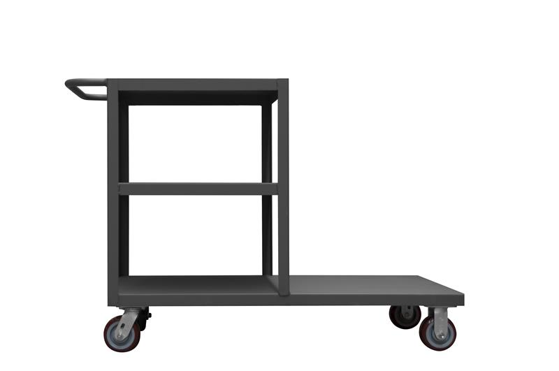 Durham platform truck. 5 in. by 1-1/4 in. polyurethane bolt-on casters;(2) swivel and (2) rigid. Includes 3 shelves (24 x 24 in.). Easy to assemble, no tools required. Gray, textured powder coat finish.