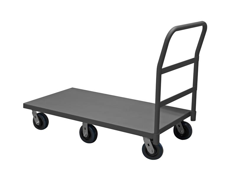 Durham platform truck. 6 in. by 2 in. polyurethane bolt-on casters;(4) swivel and (2) rigid. Easy to assemble, no tools required. Gray, textured powder coat finish.