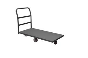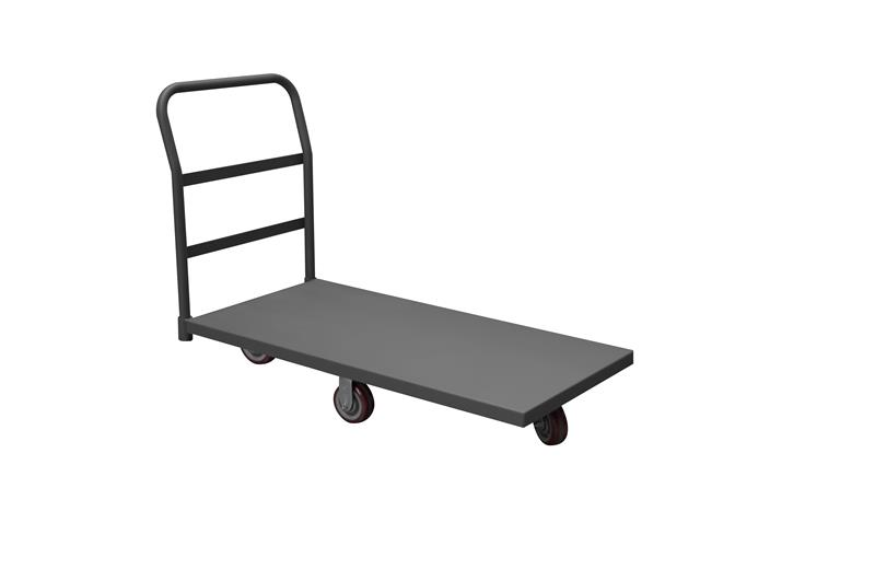 Durham platform truck. 5 in. by 1-1/4 in. polyurethane bolt-on casters;(2) swivel and (2) rigid. Easy to assemble, no tools required. Gray, textured powder coat finish.