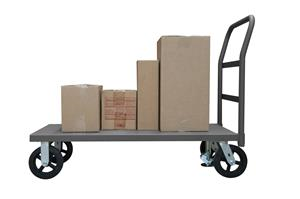 Durham platform truck. 8 in. by 2 in. Mold-On Rubber bolt-on casters;(2) swivel and (2) rigid. Easy to assemble, no tools required. Gray, textured powder coat finish.
