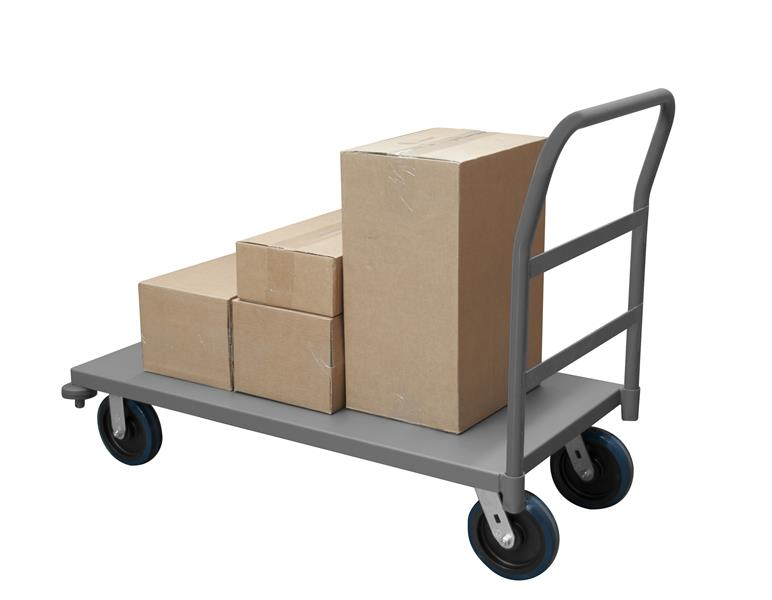 Durham platform truck. 8 in. by 2 in. polyurethane bolt-on casters;(2) swivel and (2) rigid. Includes corner bumpers. Easy to assemble, no tools required. Gray, textured powder coat finish.