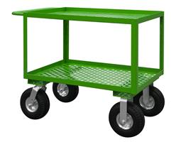 Garden Cart, with (2) 10 in. rigid Pneumatic wheels and (2) 10 in. swivel Pneumatic casters. Includes 2 perforated shelves, 18-1/16 in. distance between shelves, tubular push handle and 1-1/2 in. lips up. Shelf Dimensions (2) 24 x 48. Capacity 1,000 lbs. Material: 12 Gauge Steel (Fully Welded). Color: Green, textured, powder coat finish