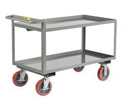 All-welded, heavy-duty steel shelf truck provides easy maneuverability of goods. Shelves are formed from 12 gauge steel with structural angle sub-frame and shelf reinforcements.