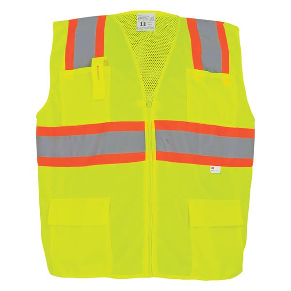 FrogWear - ANSI class 2 yellow/green surveyor's safety vest, solid front, lightweight mesh polyester back, 3M reflective material, zipper closure, four front pockets.
