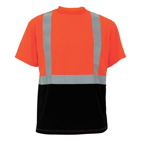 ANSI class 2 orange self wicking birdseye mesh short sleeved shirt with silver reflective material, black bottom front and left breast pocket.