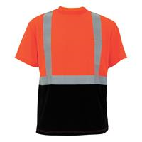 ANSI class 2 orange self wicking birdseye mesh short sleeved shirt with silver reflective material, black bottom front and left breast pocket.