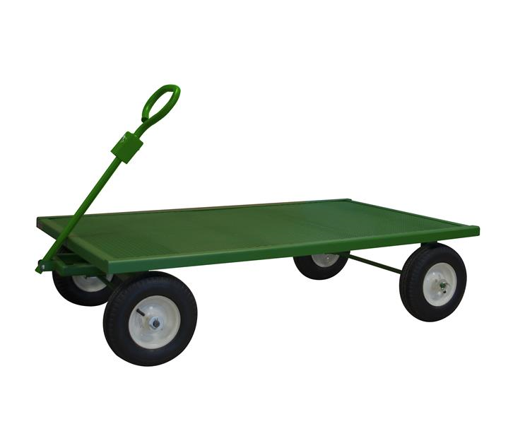5th Wheel Garden Truck, with 12 in. x 3-1/2 in. Pneumatic wheels, tubular handle, and perforated decks. Overall Capacity: 1, 200 lbs. Dimensions Overall in: 36 x 60. Material: 12 Gauge Steel(Fully Welded). Color: Green, textured, powder coat finish