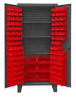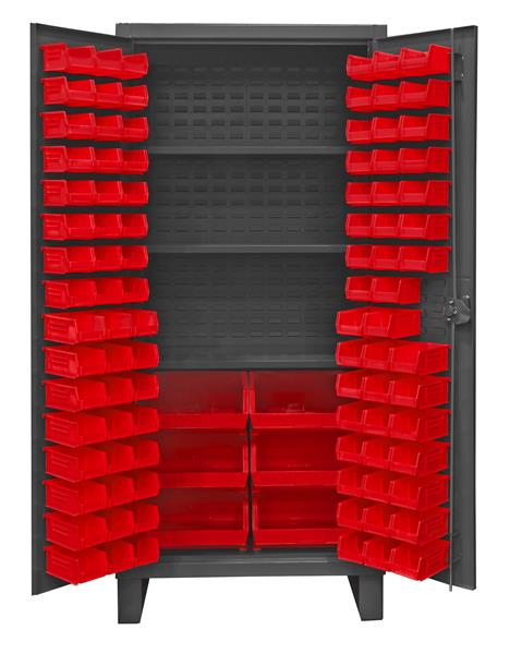 36 in. wide extra heavy duty all welded 12 gauge steel, lockable cabinet, with 102 red hook-on bins, 3 adjustable shelves, 1750 lbs capacity per shelf, recessed door style, Gray, textured powder coat finish.