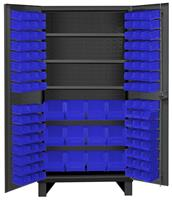 36 in. wide extra heavy duty all welded 12 gauge steel, lockable cabinet, with 108 blue hook-on bins, 3 adjustable shelves, 1750 lbs capacity per shelf, recessed door style, Gray, textured powder coat finish.