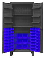 36 in. wide extra heavy duty all welded 12 gauge steel, lockable cabinet, with 60 blue hook-on bins, 2 adjustable shelves, 1750 lbs capacity per shelf, 6 door shelves, recessed door style, Gray, textured powder coat finish.