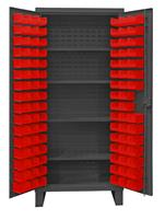 36 in. wide extra heavy duty all welded 12 gauge steel, lockable cabinet, with 96 red hook-on bins, 4 adjustable shelves, 1750 lbs capacity per shelf, recessed door style, Gray, textured powder coat finish.