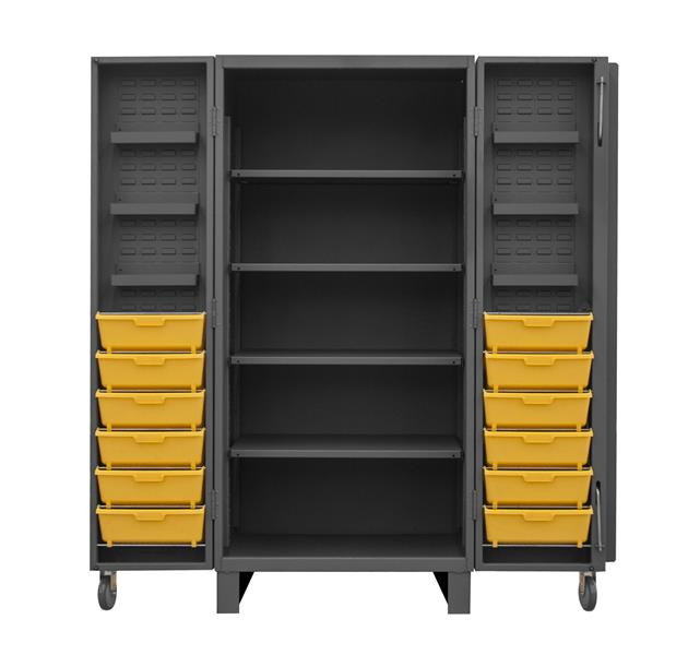 36 in. wide, 12 gauge, lockable cabinet, with 12 yellow tilt bins, 4 adjustable shelves, 1900 lbs capacity per shelf, 6 door shelves, deep door style, Gray, textured powder coat finish.