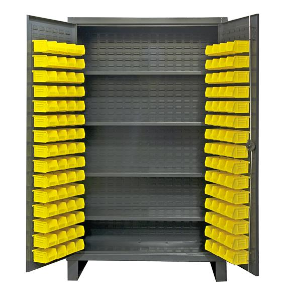 48 in. wide extra heavy duty all welded 12 gauge steel, lockable cabinet, with 120 yellow hook-on bins, 4 adjustable shelves, 1000 lbs capacity per shelf, recessed door style, Gray, textured powder coat finish.