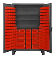 48 in. wide extra heavy duty all welded 12 gauge steel, lockable cabinet, with 134 red hook-on bins, 3 adjustable shelves, 1000 lbs capacity per shelf, recessed door style, Gray, textured powder coat finish.