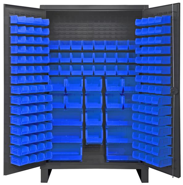48 in. wide extra heavy duty all welded 12 gauge steel, lockable cabinet, with 162 blue hook-on bins, recessed door style, Gray, textured powder coat finish.