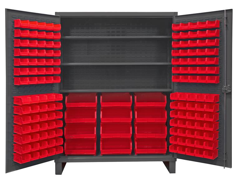 60 in. wide extra heavy duty all welded 12 gauge steel, lockable cabinet, with 156 red hook-on bins, 3 adjustable shelves, 750 lbs capacity per shelf, recessed door style, Gray, textured powder coat finish.