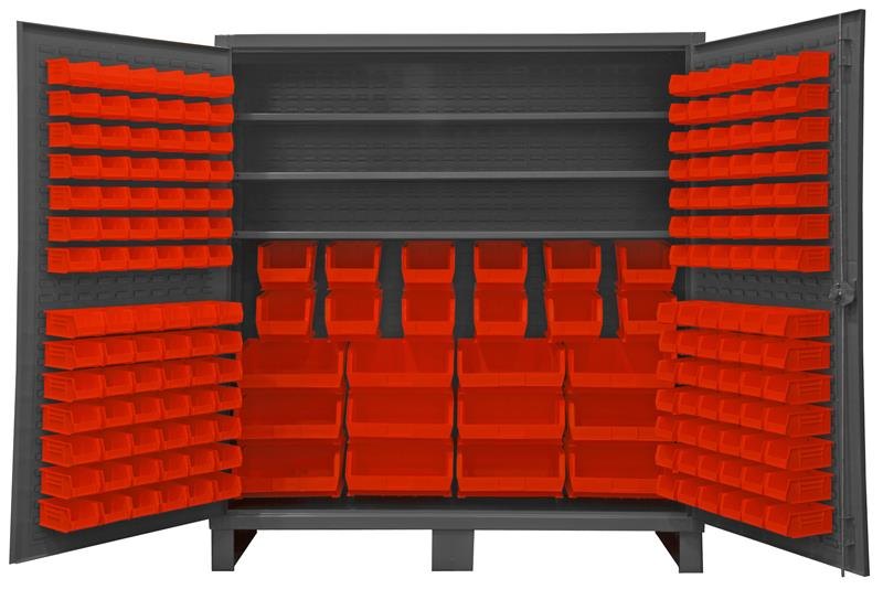72 in. wide extra heavy duty all welded 12 gauge steel, lockable cabinet, with 192 red hook-on bins, 3 adjustable shelves, 750 lbs capacity per shelf, recessed door style, Gray, textured powder coat finish.